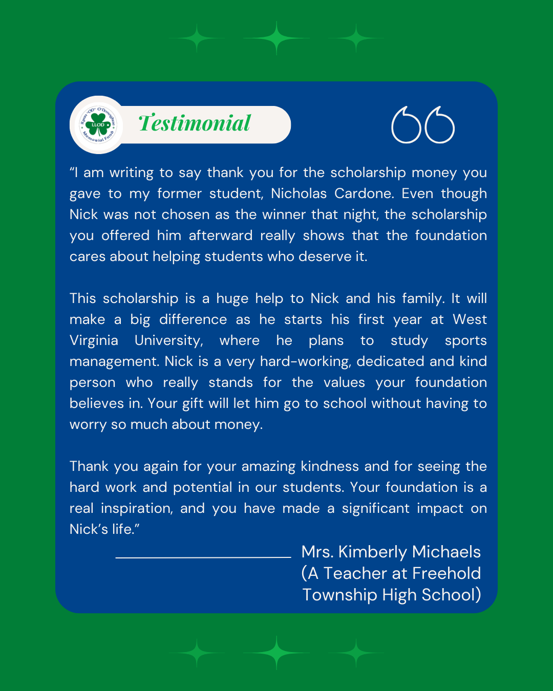 The Ryan “OD” O’Donoghue Memorial Fund is dedicated to providing scholarships to students attending Freehold Township High School who embody the values that defined Ryan: kindness, perseverance, and a passion for sports. These scholarships are open to eligible applicants who demonstrate leadership skills, actively participate in athletics, and show a commitment to making a positive impact in their communities.